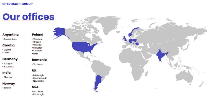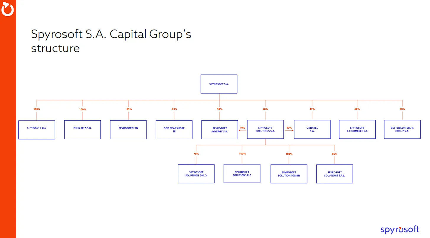 Obchodná štruktúra skupiny Spyrosoft je decentralizovaný model s vysokým stupňom nezávislosti a zodpovednosti od dcérskych spoločností. Spoločnosti skupiny sa špecializujú na rôzne odvetvia a sú geograficky rozptýlené takým spôsobom, že ponuka služieb sa navzájom dopĺňa a sú lepšie prispôsobené časovým pásmam zákazníkov.