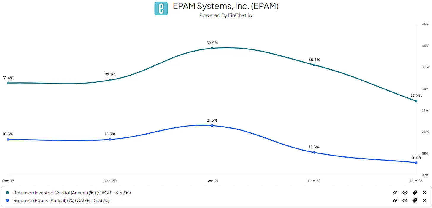 Metriky kapitálovej efektívnosti vyzerajú dobre. Udržiavanie vysokých hodnôt ROE a ROIC je prvoradé. Predošlé roky boli trochu narušené silným rastom spoločnosti (z nízkej porovnávacej základne), covidom a relatívnym rozbehom spoločnosti. Preto, takisto ako pri maržiach, by som nepredpokladal návrat k minulým hodnotám. Pre porovnanie prikladám vývoj ROIC a ROE pre zabehnutú spoločnosť v tomto segmente ako je EPAM Systems.