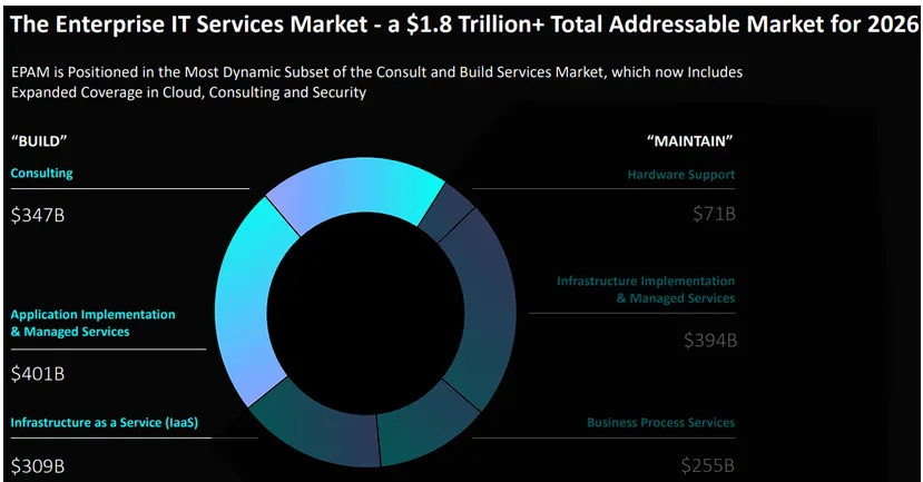 Napriek tomu je sektor IT služieb svojou povahou silne roztrieštený a konkurenčný. Bariéry vstupu pre tento trh sú nízke, keď aj šikovný jednotlivec dokáže poskytovať poradenské služby v oblasti IT sám. Preto je pre spoločnosti ako Spyrosoft dosť náročné vybudovať si konkurenčnú výhodu na tomto trhu. Napriek tomu je celkový adresovateľný trh dostatočne veľký. Nižšie prikladám očakávaný vývoj trhu z prezentácie pre investorov od spoločnosti EPAM. Vzhľadom na veľkosť spoločnosti Spyrosoft potrebuje získať len malý kúsok koláča, ktorý zapríčiní výrazný nárast biznisu.
