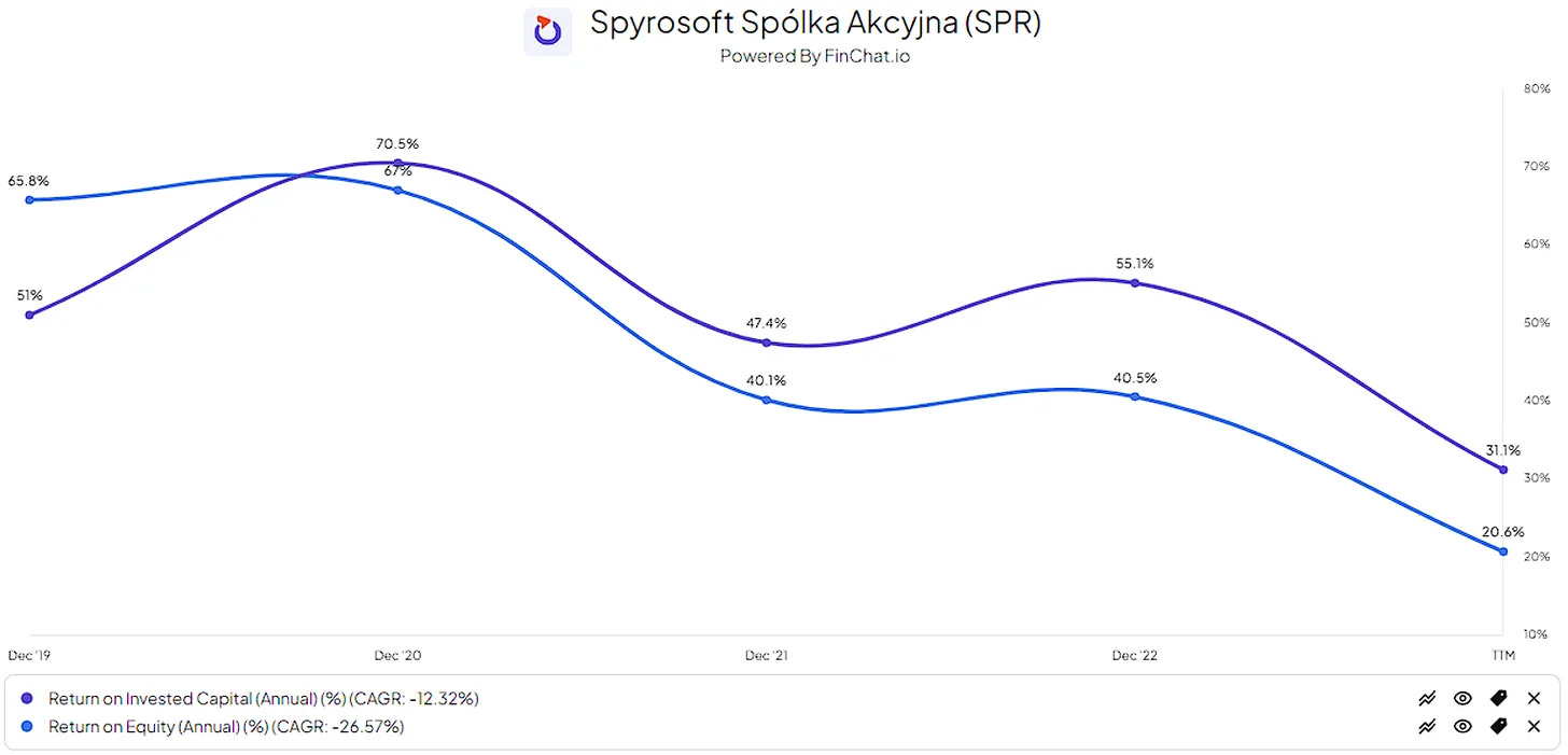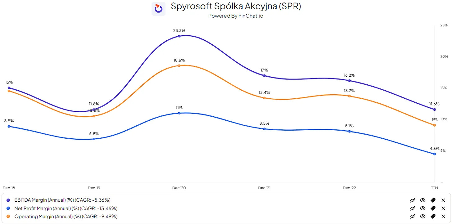 Vývoj marží nie je nijak pôsobiví. Momentálne sa nachádzame na spodku cyklu, keďže kvôli zhoršenej ekonomickej situácii v Európe, FX a zvýšeným nákladom na udržanie si ľudí na lavičke (momentálne nevyužití zamestnanci) sa marže znížili oproti historickému priemeru. Napriek tomu Spyrosoft ako jediný oproti svojej konkurencii dokázal rásť a naberať nových zamestnancov. Zníženie sadzieb určite odvetvie digitalizácie nakopne naspäť. Otázka je ako sa dovtedy bude Spyrosoftu dariť.