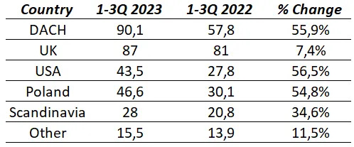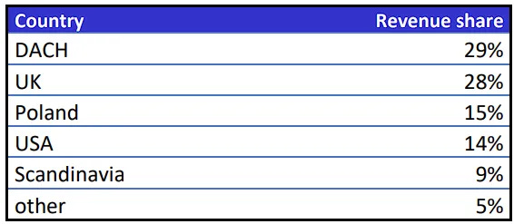Za posledný rok sa trh DACH (Nemecko, Rakúsko a Švjačiarsko) stal najdôležitejším a takmer najrýchlejšie rastúcim. Spomalenie zažíva najmä trh v UK, ktorý má podstatné, 28%, zastúpenie na celkových tržbách. Ďalší vývoj na trhoch naprieč bude dôležité sledovať.