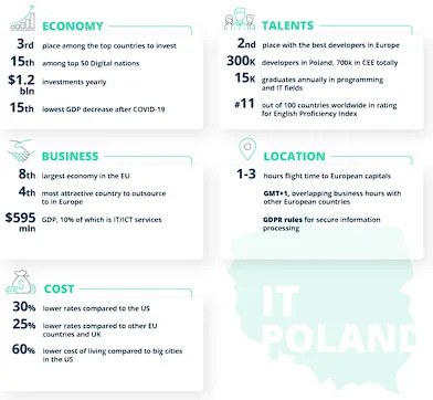 Ak sa pozrieme na Poľsko, možno odvodiť viacero dôvodov pre jeho atraktívnosť v oblasti IT. (1) Poľsko v minulosti zaznamenalo silný rast ekonomiky, tento trend analytici predpokladajú aj do budúcnosti. Minulý rast pomohol Poľsku (2) pretransformovať sa na jeden z najdigitálnejších národov Európy, pričom IT sektor predstavuje približne 10% HDP. To poskytlo priateľské prostredie pre vývoj softvéru a viedlo k veľkej skupine kvalifikovaných IT talentov, ktoré môžu byť zamestnané za nižšie náklady ako v ostatných krajinách EU.