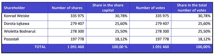 Spoločnosť Spyrosoft bola založená v roku 2016 Konradom Wieskem (CEO), Wojciechom Bodnarusom (CFO), Sebastianom Lekawom (predstavenstvo) a Andrewom Radcliffeom (generálny riaditeľ spoločnosti Spyrosoft UK). Dnes manažment a ich rodinní príslušníci vlastnia 82% spoločnosti. Rodinní príslušníci uvádzam preto, že podiel pána Bodnarusa a pána Lekawa je napísaný na ich manželky. Zaujímavosťou je, že ako pôvodný funding zakladatelia potrebovali len 200,000 GBP.