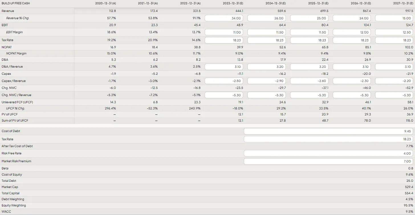 Aby som dospel k relatívne spravodlivému oceneniu, jednoducho som modeloval vývoj základných finančných ukazovateľov na 5 rokov dopredu. V roku 2023 očakávam doručenie 34% rastu na tržbách – vychádzam z toho, že tržby za obdobie 1-3Q 2023 rástli o 34,3%. Do ďalších rokov čakám určité spomalenie, avšak stále predpokladám rast o približne 22% CAGR. Vývoj marží budem očakávať v rozmedzí 11-13% EBIT. Prvé roky môžu byť marže nižšie kvôli ďalšiemu rozširovaniu podnikania. Úmerne tomu som zvýšil aj CapEx a D&A.